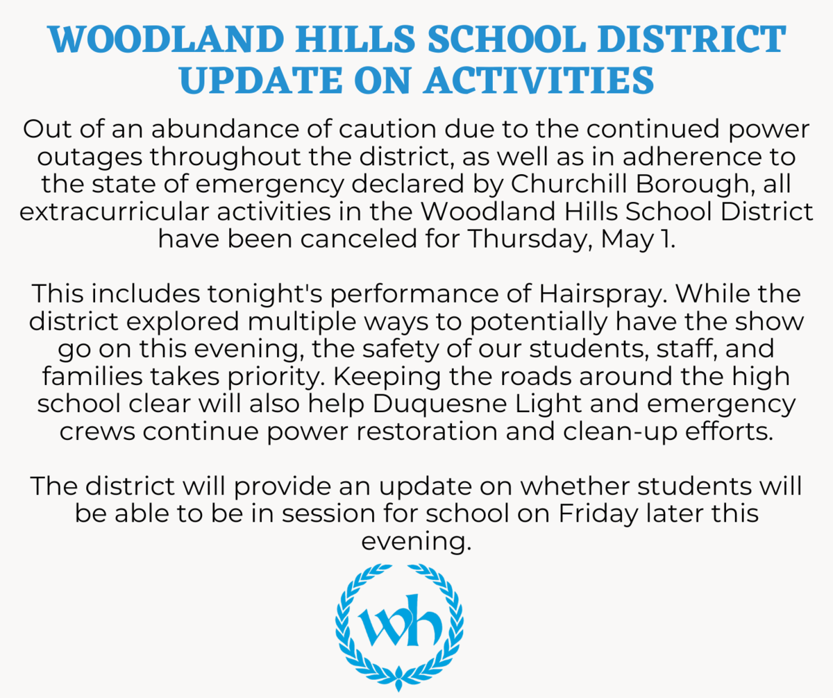 Out of an abundance of caution due to the continued power outages throughout the district, as well as in adherence to the state of emergency declared by Churchill Borough, all extracurricular activities in the Woodland Hills School District have been canceled for Thursday, May 1.