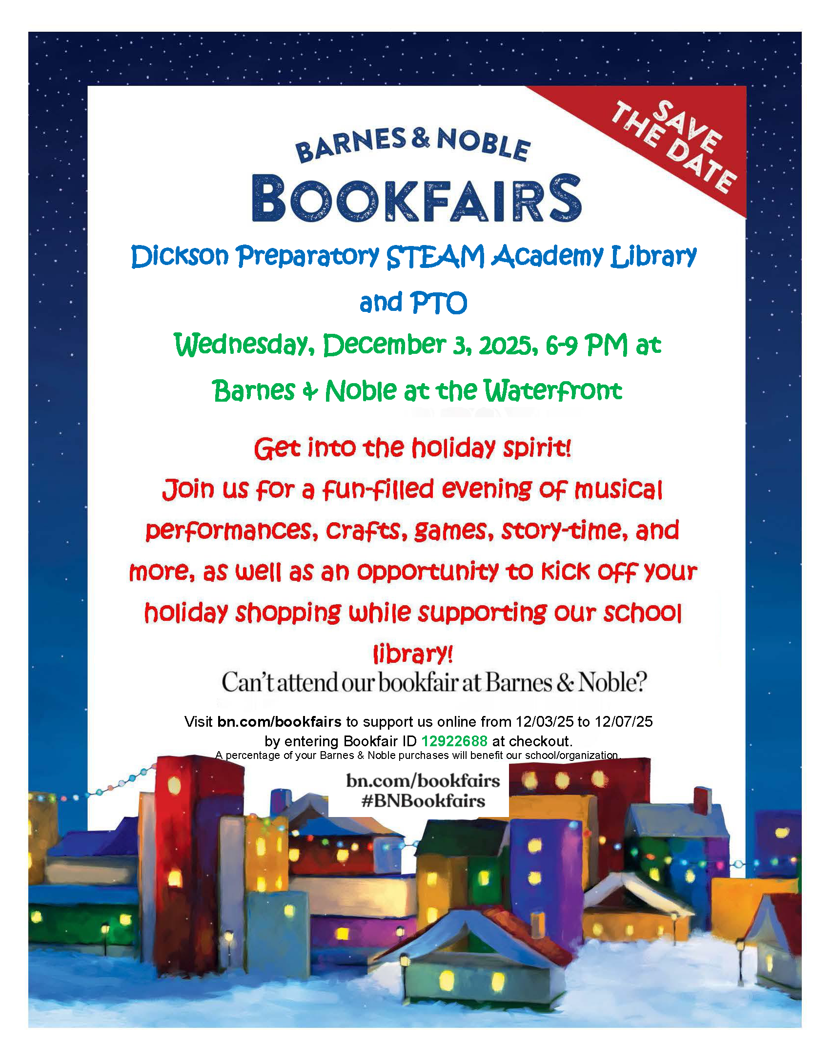 Stop by the Barnes and Noble at the Waterfront on Wednesday, December 3 from 6 p.m. to 9 p.m. for the Dickson Preparatory STEAM Academy PTO and Library Book Fair!