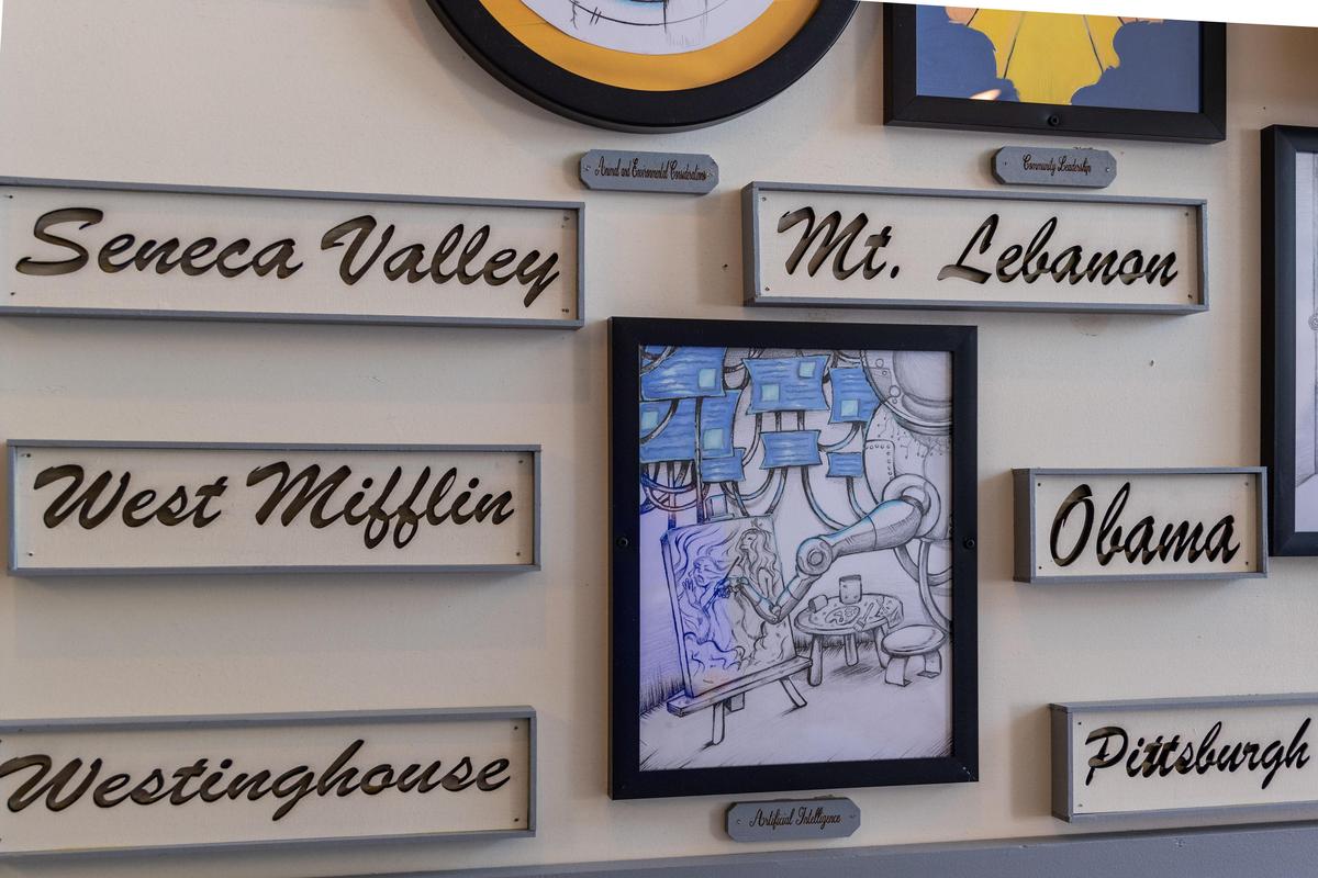 Over the next few months, she and Mr. Beard worked away at their project. Mr. Beard used his woodworking skills to create the frame and mount it on a transportable display. He also etched blocks with the names of each of the participating schools and secured picture frames in strategic locations on the piece. In the center of the mural, he mounted the logo for this year’s summit that was created by 2025 Belle Vernon graduate Luciano Lopez, who was a leader for several years.